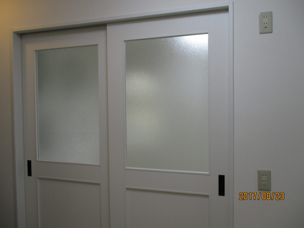 元々開き戸だったので開け閉めすると狭いお部屋では出入りするのに意外と邪魔です。今回開口を広げて引き違いの戸を付けて上部はすりガラスタイプにして明るくなるように少しでも広く感じられるようにしました。